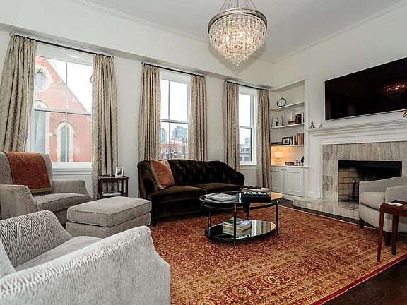 Waterside Brimmer on the Flat of Beacon Hill with Charles River Views! Sublimely renovated in 2017 this upper level duplex home is the personification of taste & elegance. The grand living room boasts classic Boston views and features oak flooring, marble fireplace, craftsman built-in & dentil molding. All highlighted by one of the homes many designer chandeliers and framed by custom draperies. Open to the formal dining space, a perfect design for entertaining. On the river side of the home you find the sensational master suite. Immediately your eyes are drawn to the Juliet balcony doors and views of The Charles. Romantic fireplace, en-suite marble bath with frameless glass walk-in shower & radiant heat floors. Privately located downstairs is the guest suite with 3rd fireplace, Juliet balcony doors, dressing room & en-suite marble bath. Formal Entry foyer with oak floors & custom staircase. Elegant hardware, in-unit laundry room, central AC. Two generous storage rooms. Common Roof deck