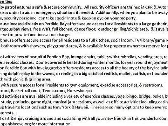 This extra private RV lot is at a prime location in the Land Harbor section of Spanish Cove. Because of being across from the intersection with Elberta Loop, there's more room to maneuver when putting your RV on the lot. It's also just a short way down Elberta Loop to the RV clubhouse with the library, activities room, laundry facilities and bathrooms with showers, as well as the workout center with all kinds of exercise equipment. The large concrete pad (16' x 31.5') has plenty of room for your RV of choice as well as room to spread out for enjoying the shade of the trees and blooming shrubs on all sides. There's even a sizable storage building (10' x 12') for keeping the extras dry, out of sight or locked up while you're traveling. You also have the options of placing a Park model mobile home if you want something more permanent. In addition to the RV clubhouse amenities, your association dues ($209/quarter) cover use of all other neighborhood amenities (tennis courts, bayfront clubhouse, heated pool that's useable year-round, fishing pier, shuffle ball, basketball), garbage and debris collection, 24-hour security patrol and activities planned for on and off site. Subdivision is also a short drive to the county's public boat launch for those with boats. So here is your chance to have an RV lot in the highly sought after Spanish Cove subdivision. Have a place by Perdido Bay to park you RV and boat, to live in or to vacation. This is a little piece of Paradise. Bay access and dock, 2 miles from the Lillian boat launch into Perdido Bay, 20 minutes to Foley or Pensacola, 15 minutes to the white sand Beaches of Perdido Key on The Gulf of Mexico. (New owner to verify all info.)