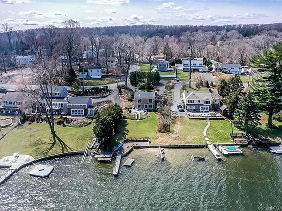 Direct almost level waterfront on Candlewood Lake with two patios, dock (AS IS huge circular drive for all your cars and guests Excellent location-minutes to shopping (Stew Leonards, Costco, BJ's, Kohl's, ShopRite, home depot and more restaurant's and Hiways This house is as charming as they come with vaulted shiplap ceilings on the upper level, hickory wood floors, stone fireplace and bay window in living room, 3 bedrooms with carpet, primary has a bay window with window seat that has great views of the lake. The main level which is the lower level walks out to waterfront with family room with 2nd stone fireplace, large dining entertainment room with bays over looking the stone patio and lake front. this level also houses a full bath storage pantry, country lake kitchen with corian counters and lots of cabinets. Perfect floor plan for the lake, the lot is bordered by shrubs for privacy. There is a second patio at the waters edge with storage shed and a beachy area to walk in gently to the water there is also a wooden pier that the dock attaches to. Located in no wake zone which makes it safer for swimmers kayaks etc. Perfect for summer retreat or year round living Enjoy the Lake life 90 Minutes to NYC and on the New York state border