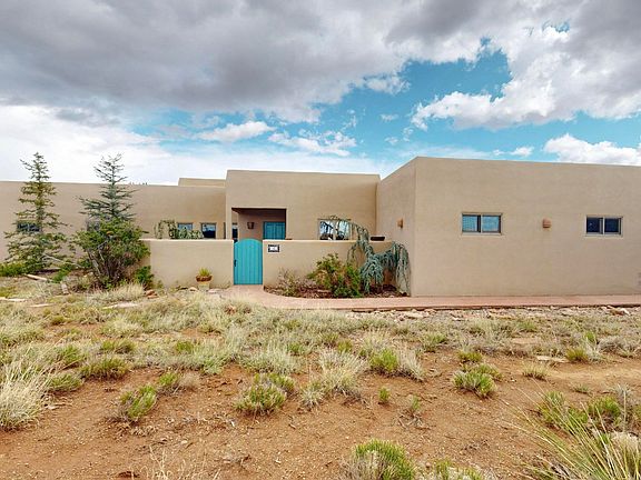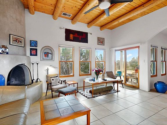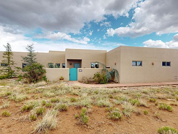 Charming custom designed and built home for the owner in 2004 by Casas de Suenos Construction on a premium lot in the Island at Eldorado. This 1510 sq ft is a split 3bedroom, 2 baths with a central open plan living concept ideal for family or guest separation. The kitchen is a good size with plenty of cabinetry and flows to the dining area and great room. A corner kiva fireplace and viga beams add that lovely Santa Fe touch. There is a 4 zone Radiant infloor heating system plus central air conditioning newly installed this year for all year round comfort. A new roof was installed also this year with a 10 year warranty. Colby double hung windows, operable skylights, annual maintenance on the natural gas boiler and hot water heater replaced in 2012. The garage is a full 2 car but has just one garage door opener installed currently. This home sits back privately from the road and enjoys south and west views from the back through the trees plus a wonderful vista of the north hills from the walled front garden. Within easy reach of Eldorado amenities, it is close to 2 local shopping centers, schools, library, senior center, playgrounds and trails, and only minutes into Santa Fe.