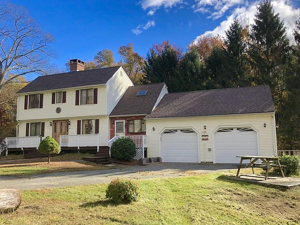 This Belchertown home is set on over 2 3/4 acres, set back over 500 ft from the road for privacy and is ready for a new owner! You will fall in love with the classic charm of this well maintained colonial with a traditional layout. The living room, family room, dining room and bedrooms all have hardwood flooring and kitchen has new appliances and plentiful cabinets. The living room and master bedroom both have a fireplace. The 14'X18' sunroom with cathedral ceiling and skylight is on the back of house and overlooks the expansive back yard with new wrap around deck. The basement is partially finished and there are two additional unfinished rooms on the second floor with a sky light for storage or finish for additional living space! There is a separate stairway to the second floor from garage. Car enthusiasts will love the enormous 2 car heated garage (propane or wood), with 1/4 bath, air compressor, flat screen TV and work area!