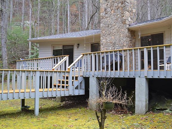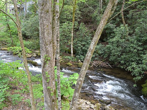 Amazing Waterfront Mountain home! Private, extraordinary location. Spectacular property on the edge of beautiful, noisy Buck Creek, near the dramatic Highlands Gorge. IDEAL VACATION RENTAL. Enjoy huge 40' deck any time of day. Gentle creek access for safe wading. Sit on a huge bolder with your feet in the water, admire gorgeous rock formations, and enjoy fly fishing from your own property. This home is a superb find indeed! While you can always enjoy the sounds and sights of the rushing clear mountain water, rest assured, you are not in a flood plane. - Home provides One Level Living and 2 (split plan) Master Bedrooms, one on each side of the house.- Features a nearly new roof, hardwoods, lots of decking, and stone fireplace and chimney. Open, Practical Floor Plan. Gorgeous Hardwood Floors, High Vaulted Ceiling. Dscover the great fishing, hiking, & recreation areas between Franklin & Highlands, NC. Just 12 minutes to grocery shopping in Franklin and impressive dining and shopping in Highlands. This Lovely Home was built to enjoy Magnificent Creek Views and Sounds of Nature in one of the U.S.'s greatest Vacation Destinations.