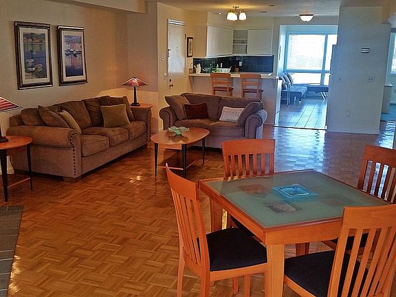 Direct water view 2 bedroom, 2 bathroom condo steps from Thames St, restaurants, stores, parks, and short walk to downtown Newport. South facing deck overlooking the water. Washer and dryer. Deeded 37 ft. boat slip. Two parking spaces (one covered), large storage room with window in basement. All utilities included