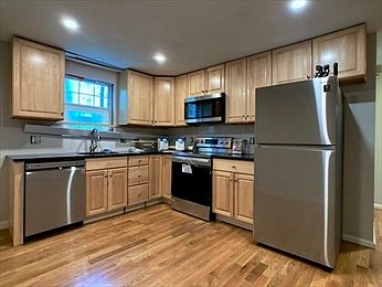 NEWLY RENOVATED RAISED 2- FAMILY offers 1250sf of Living Space. This 1st Floor unit features 2 Large Bedrooms, Eat In Kitchen with New Cabinets, Granite/Stainless, D/D, NEW FLOORING. Bathroom offers NEW TUB/SHOWER & VANITY. ALL NEW OAK H/W FLOORS THRUOUT; LR with Brick Fireplace, Large Formal DR. W/D STACKABLE ONLY H/UPS in Basement. Shared Rear Deck & Yard. Ltd Basement Storage.! Two Tandem Driveway Parking Spaces Included. Eliot Street D-Line! Owner pays water & sewer & Driveway Snow Removal & Grounds Maintenance. Tenant pays Heat, Hot Water, Electricity.