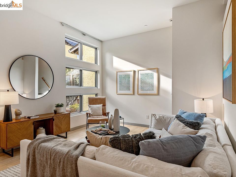 Gorgeous south facing, 2 bedroom, 2 bath townhouse: What makes this home extra special is the abundant natural light, lofty 10’ ceilings, plus a deep garage (EV ready) with interior access and an additional parking space right outside on the private street. This spacious, award winning David Baker designed tri-level home has two levels of living space above its flex space which includes a full bath, laundry area and polished concrete floors. The central level has an open-concept kitchen, dining, and living room all with maple wood floors. The kitchen features modern finishes, ample storage, stainless steel appliances. Windows to the south and west provide access to the beloved bay breezes. Upstairs you’ll find two generous bedrooms w/ large closets, views of the tree canopy + open sky as well as a second full bath w/ skylight. In unit laundry and private fenced patio. West End Commons is a tree-lined, gated enclave with lush established gardens on the W. Oakland/Emeryville border. Low dues of $306/mo include EQ insurance. Shopping, transportation corridors and BART nearby. The adjacent Mandela Pkwy Greenway features bike lanes, walking paths and grass lawns.