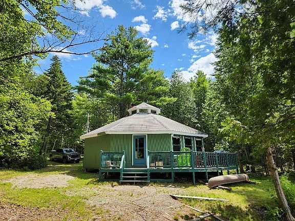CEDAR LAKE CAMP, With BEACH and 0.80 ACRES. This camp has been in the family for many years. Has a great view of the lake and was uniquely built with friends and family being TOGETHER. This camp was Built Octagonal with a large circular platform, open ceilings, and a glassed-in cupola. Completely round with the kitchen and dining area overlooking the lake, living room, and many sleeping areas for all your friends and family that you invite for the summer weekend. A full bathroom with a standup shower gives you privacy and amenities of home. A sunken family room has built-in seats for comfort that surround a large brick fireplace and is the focal point of this camp, perfect for sharing new, and old memories of past and present. The camp has hardwood floors throughout, with slate flooring in the family room. Walking into this camp gives you the feeling of togetherness. Have a picnic or Relax on the front porch with direct views of CEDAR LAKE, walk down to the private beach, and walkout wharf/dock ideal for swimming or lounging in the beautiful sunshine. The BEACH has a shallow entry and is great for swimming. CEDAR LAKE is an intimate spring-fed lake, and easier to navigate by boat than some of the larger lakes. The lake is 685 Acres with a maximum depth of 24 feet. The lake is large enough for a float plane and perfect for boating, fishing, or kayaking the shoreline. There are several ITS snowmobile trails to access throughout the area for the recreational enthusiast. The town of Millinocket is approximately 15 minutes away, where you can enjoy shopping, restaurants, and hometown activities. This camp is waiting for you!