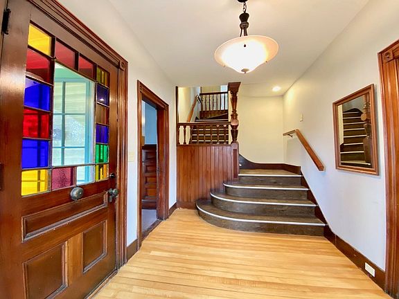 Beautiful well-maintained large city home. This is truly a one of a kind city location sitting on .45 acres with a large carriage house barn. The minute you enter this home into the beautiful foyer you will be surrounded by the original character. Stained glass windows and entry door, original wood crown molding, hardwood floors and a gorgeous fireplace completes the living room. There is plenty of space in the dining area to host dinner parties along with a large family room. A primary bedroom with an attached bathroom is conveniently located on the main level. Wind your way up the gorgeous stairway and you will find three more bedrooms, a den, full bathroom and a kitchen area. Just off the upstairs kitchen area is a large deck, perfect for your overnight guest to have their morning coffee or evening glass of wine. The two-story carriage barn is perfect for anyone looking for ample storage space. Ideal for those who enjoy woodworking, restoration work, gardening, or other artistic endeavors.