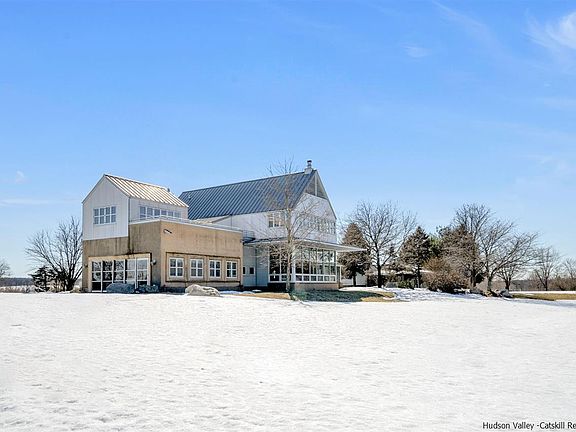 Nestled within the most peaceful setting with panoramic views of The Shawangunk Ridge and Mohonk Mountain sits this spectacular Contemporary home, on over 30 glorious acres, including a swimming pond. The second you walk in the home you are greeted by custom designed Terrazo floors and a long hallway that opens up to the main living space with high beamed ceilings and a plethora of windows provides the most amazing views of meadows and mountains. There's a Wolf wood-burning stove and plenty of room here to stretch out, relax and entertain. The Gourmet Kitchen is Grand with an extra large Island taking center stage with a built-in Viking stove & Hood and seating for 8. There's plenty of polished concrete counter space an abundance of custom-made solid core cabinets and drawers. In the warmer months you can enjoy your meals with a view in the screened-in porch just off the kitchen. There is also a large walk-in pantry perfect for stocking up on those groceries. The first floor Master in conveniently located on the opposite side of the house and boasts a wall of windows facing Mohonk Mountain's Skytop Tower and a door leading out to a private patio. Also included in the master is a walk-in closet, an en suite bath with jetted tub and a steel staircase that leads up to a private office with access to a roof top terrace. Completing the 1st level is a guest bedroom, full bath and laundry room. Upstairs is home to 3 well-sized guest bedrooms, a full bath and access to the roof top terrace. This is the spot for maximum relaxation in the summer, the contempo designed terrace offers unobstructed panoramic mountain views. Outside, across a lovely landscaped area with a lush garden, mature trees & shrubs and artfully placed boulders there is a very large studio space and 4+ car garage with heat, water and electric. The studio is the perfect spot for a workshop, work from home space, gym, art studio etc. This a truly a one-of-a-kind property and it has the added bonus of being perfectly located just minutes to the Villages of New Platz & Gardiner, Minnewaska Lake State Park, Mohonk Preserves, Tillson Lake, Trailways Bus station, and so much more!