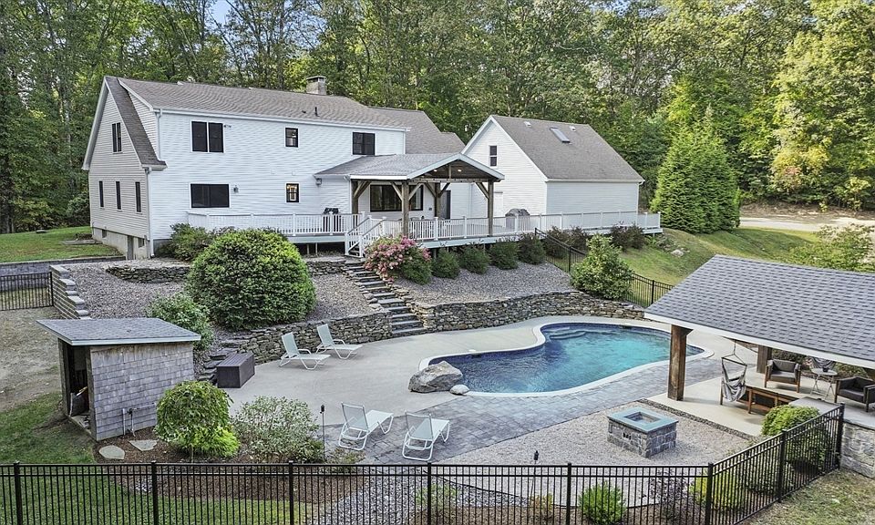Set on 12 private acres, this sprawling Cape sits back from the road and offers over 3,600 sq ft of living space w/ 5 BRs & 3 full baths. The remodeled chef’s kitchen is the heart of the home, boasting high-end finishes including custom cabinetry, Sub-Zero, Thermador & Bosch appliances, plus a 12’ granite island. Off the kitchen, a front-to-back family room shines w/ natural wood ceiling, while the living room features a soaring cathedral ceiling & stunning floor-to-ceiling fieldstone fireplace. The oversized 1st-floor primary suite includes a spa-like bath w/ tiled shower & double vanity. Upstairs offers 3 generous BRs & full bath. Designed for entertaining, the backyard oasis includes a gunite lagoon pool, pavilion w/ outdoor kitchen & expansive composite deck w/ additional pavilion. For animal lovers, a multi-stall barn & pasture complete this rare estate retreat! All the privacy you want, yet minutes to Rt 290/395/Mass Pike, shopping, restaurants.