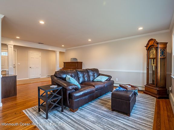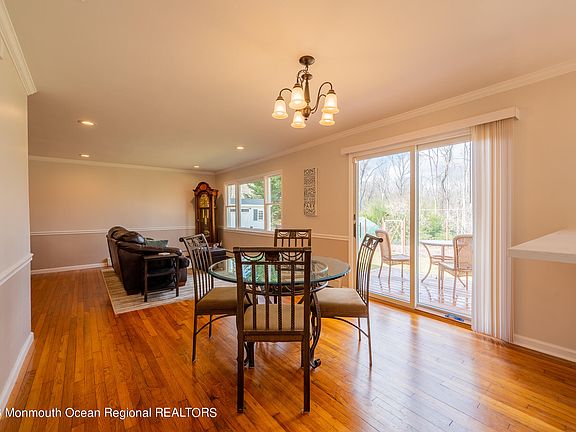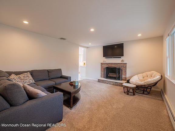 This sprawling 4 bedroom ranch located in the heart of Lincroft features a newly renovated eat in kitchen 2 updated baths, a family room with a fireplace, finished basement and hardwood floors in the living room, dining room and the bedrooms. The exterior features a front porch with blue stone, cedar impressions, and a beautiful private 1 acre lot. Room measurements are approximate.