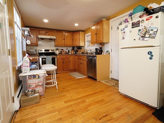 Welcome home to this charming 2 bdrm, 1 bth cape with all hardwood floors on a double lot to provide a partially fenced in backyard and off street parking for 4 cars and a shed on a one way street. From the driveway you walk into the kitchen w/newer stainless steel stove and dishwasher, a refrigerator, and plenty of cabinets. The back door leads to a covered patio where you can lounge on a few chairs in your semi-private backyard. From the kitchen you head into the dining rm that has a bay window. Off that is the full bathrm with tub/shower, new toilet & stackable washer/dryer. The living rm is a good size and has a bay and side picture window. Off the living rm is a bonus room that can be used as an office and has a door to the backyard. Go upstairs and you have 2 spacious bedrms - the Main bdrm has a walk-in closet, plus small open closet. The second bdrm is just as spacious. MassSave did blown in insulation in 2019 and an upgraded Navien Gas furnace w/On Demand HW. Come take a look!
