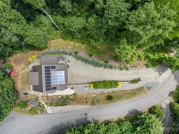 Eco-friendly home, thoughtfully crafted around a sustainable lifestyle and offering a peaceful sanctuary perched in the trees. Beautiful stone walkways and Poplar bark/timber-framed entry. Open concept main level offers a light-filled primary suite and the ultimate indoor/outdoor space - the living, kitchen and dining area open into a screened-in porch and grilling deck via a Solar Innovations sliding wall. Upstairs has two more bedrooms, full bath, and a crow’s nest overlooking the tree canopy. Lower-level efficiency unit with kitchenette, full bath, private entrance, and flagstone patio. Lovely studio outbuilding built by master carpenter ties the charm of this property together. Climate-controlled 2-car garage would make an amazing workshop, EV charger, 30-amp RV plug in and Grid-Tied Solar panels. Low-maintenance, 1.72-acre lot on quiet cul-de-sac in Village Greens with no active HOA or Dues. Just 12 min to Downtown Asheville and 10 min to Weaverville.