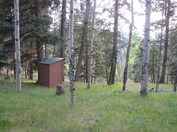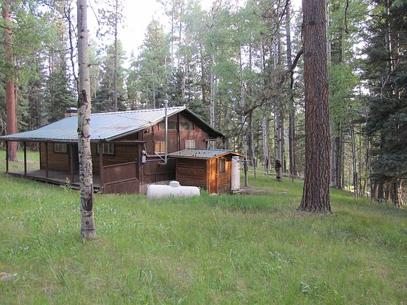 This classic mid-century style cabin is located in the Santa Fe National Forest north of the town of Pecos. It is surrounded by tall pine and aspen trees on Grass Mountain overlooking Windsor Creek Canyon and the high mountains behind Santa Fe. The cabin has covered front and back porches and a large central open area with fireplace, beds on one side and a kitchen, dining area and freestanding self-lighting propane heater on the other. The cabin also includes a separate and recently updated 3/4 bath with electric heat. Water for the shower, toilet, and kitchen sink gathered from rainfall from the propanel roof, stored in a large cistern, then pressurized and heated as needed. Buyer's are required to have a face to face meeting with Forest Officials prior to a sale following successful negotiations. A new special use permit will be then issued to the new owner. This is a cool and comfortable mountain retreat with great access to the wilderness.