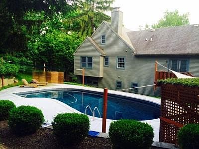 An absolute gem! Beautiful custom home nestled on 9+ acres in tranquil country setting. Stunning entry into living rm w/ soaring cathedral ceiling, gleaming hw floor and abundance of natural light is true focal point of the home! Master bedrm suite w/ high ceiling, his/her closets, ensuite bath and private deck overlooking gorgeous inground pool - a vacation oasis in your own backyard! New hw floors and central air. Unfin walk-up attic and large bsmt offer more potential! Exterior features large, screened corn crib (endless possibilities!),3 stall barn, fenced side yard, quaint patio area, and oversized outbuilding w/ electric suitable for hobbyist, garage,etc. Property extends beyond corn crib. Pls note: Exterior to be painted and decks stained. Outdoor furnace not used and strictly as-is. Come fall in love!