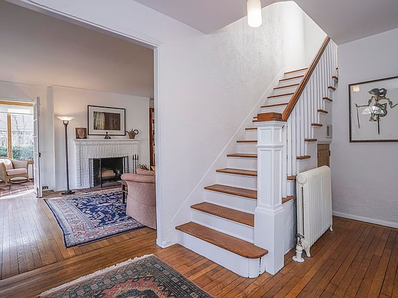 Art deco exterior details, large, bright, double-pane windows and open kitchen, breakfast and dining spaces lend a modern flair to the center hall layout with formal foyer, living room with fireplace and adjoining sunroom with second fireplace and back den, full bath and family room. Three well-sized bedrooms and second full bath upstairs. Immense bluestone patio with sliding doors from family room and situated in woodland setting offering great privacy for delightful summer entertaining. Located in the charming Pelhamwood neighborhood just half a block from the historic Pelham train station and within easy walk of town shops, grocery store and restaurants and all Pelham schools.
