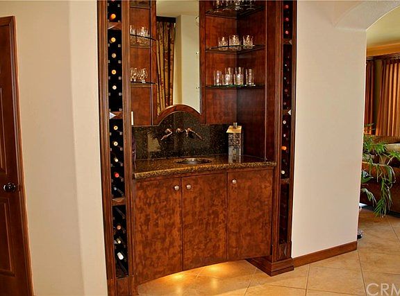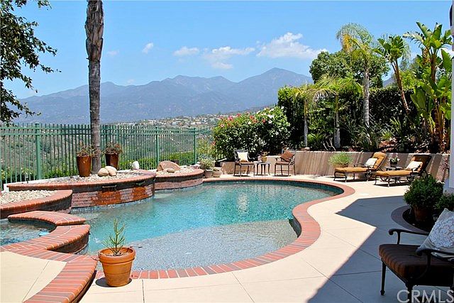 This stunning custom designed home is anything but ordinary. Exquisite custom made double doors open to the living room with soaring ceilings, a fireplace that has been transformed into a piece of art, and a dramatic teak stairway with custom wrought iron railing. The curtained formal dining room features built in china cabinets, French doors that open to a tranquil fountain with a wet bar across the hall made of maple with bronze faucets and granite counter top. The kitchen boasts maple cabinets with distressed glass and lighted display, granite counters/back splash, SS Thermador appliances. The center island has a unique stool designed at the end for additional seating. A grand but comfortable family room features built-in cabinetry that surround the solid steel fireplace. Step outside and enjoy panoramic mountain, hill and lake views, built-in BBQ and gorgeous Pebble Tech pool and spa. Main floor bedroom with private bath and separate guest bath. Master suite has ?Juliet? balcony, luxurious bath with dual vanity & copper sinks, separate tub and shower. Two spacious secondary bedrooms and custom designed office and bonus room. This home was featured in Los Angeles Homes & Décor Magazine. Artistic details in every corner of this home.