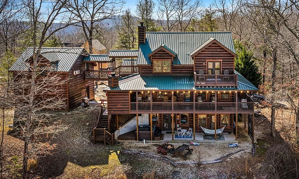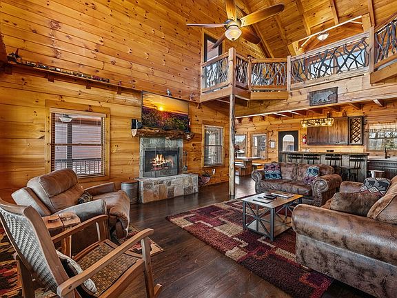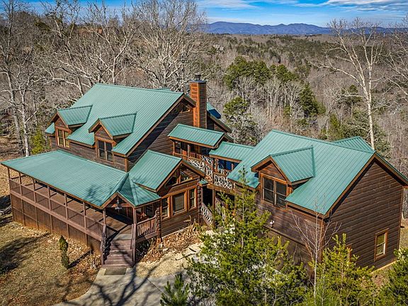 This stunning log cabin is a true mountain retreat, offering breathtaking year-round panoramic views and an incredible location just minutes from downtown Blue Ridge. With easy access via paved roads and a concrete driveway, this home combines rustic charm with modern convenience. The cabin features four spacious bedrooms, a sleeping loft, and an additional finished bunk room over the garage, all connected to the main house by a breezeway. The open-concept floor plan is designed for comfort and entertaining, boasting a great room with cathedral ceilings, exposed beams, and a stone fireplace. The kitchen is a chef's dream with custom cabinetry, stainless steel appliances, solid surface countertops, and ample dining space. The luxurious master suite on the main level includes a custom tile shower and separate tub. Upstairs, you'll find two guest bedrooms, an oversized sleeping loft, and a full bath, while the lower level offers a game room and a second master suite. Outdoor spaces are abundant, with a wrap-around covered porch featuring a wood-burning fireplace, an upper-level private balcony, and a lower-level patio with a hot tub and gentle usable terrain. The property also includes a two-car garage with a finished bunk room, making it perfect for accommodating guests or family gatherings. Home is fully furnished and short term rentals are allowed.
