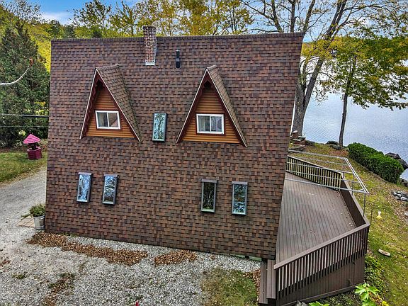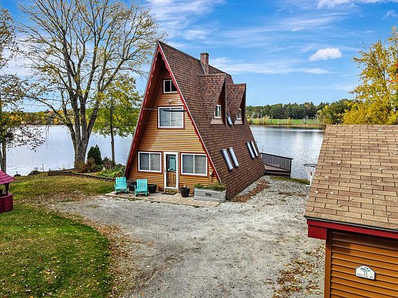 This beautifully maintained A frame has so much to offer. This custom designed home is nestled on its own peninsula which offers privacy and wonderful water views from 3 sides. There is 275 feet of gradual waterfrontage for easy water access. This year-round getaway is everything your family is looking for. Go kayaking, boating, fishing, or simply relax while you enjoy the beautiful sunsets. The interior features quality everywhere, and all the space is utilized perfectly. There are water views from every room. The kitchen has Corian counters, a large island, pantry, ample storage, tile floors, and more. First floor laundry and half bath off the living room. The living room with hardwood floors has a cozy propane fireplace, and has direct access to the large back deck that looks out over beautiful Horseshoe Pond. The upper level includes two bedrooms and a full bath. The property also features a 2-car garage plus a large workshop/storage room. This is truly a special place. Check it out today.