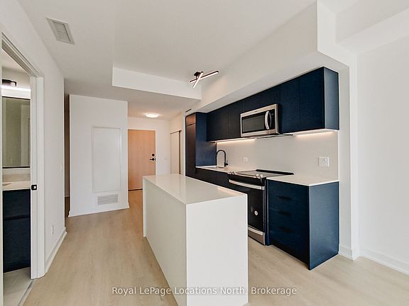 Welcome to Harbour House -- Collingwood's newest waterfront address. Live In downtown Collingwood and walk one block to the Collingwood Harbour, Station Park across the street, fabulous restaurants and shopping, all from this beautifully designed one bedroom plus den suite with south facing balcony overlooking the park. This smart unit features clean lines, sleek kitchen, modern lighting, and premium finishes throughout. Light and bright condo has primary bedroom windows overlooking the balcony, double closet and semi-ensuite with glass shower. Spacious den off kitchen makes work from home ideal. Laundry closet and separate coat closet at entrance. Enjoy the ease of a designated underground parking space, P2-41, exclusive storage locker and a low-maintenance lifestyle enhanced by a full suite of modern amenities: fully equipped fitness studio, pet spa, mail room, and two guest suites for visitors. Just steps from the waterfront, scenic trails, and downtown Collingwood, Harbour House offers contemporary living in a prime location.