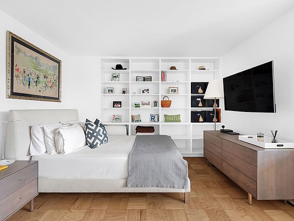 In the heart of the home, the combined living and sleeping alcove spans approximately 17' x 12', comfortably fitting a queen bed, dresser, and living area arrangement with a TV mounted on a swing arm, providing a generous and flexible layout for relaxing or entertaining. This space includes several walls of built-in bookshelves and smart storage solutionsan essential feature of a West Village home.