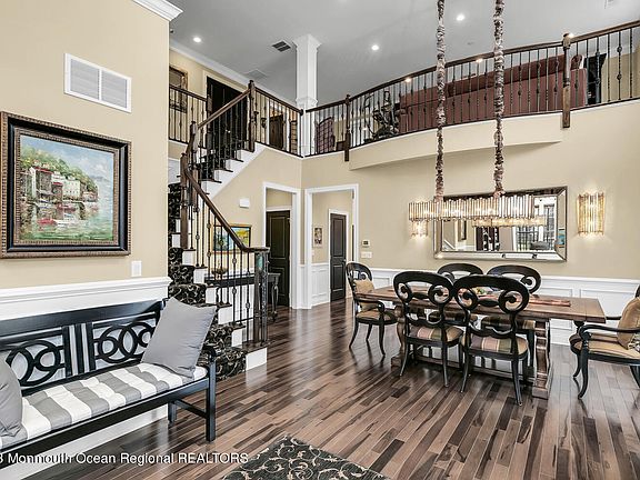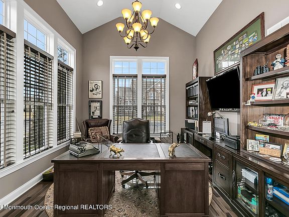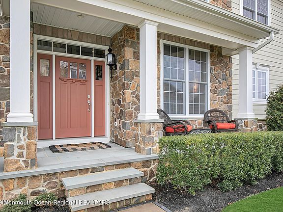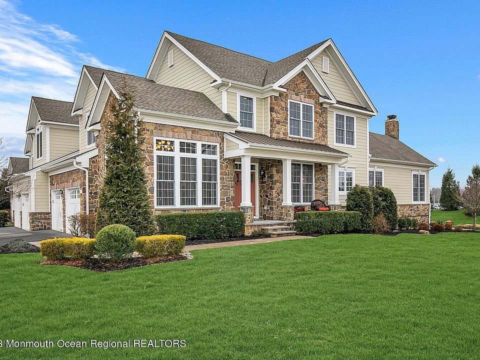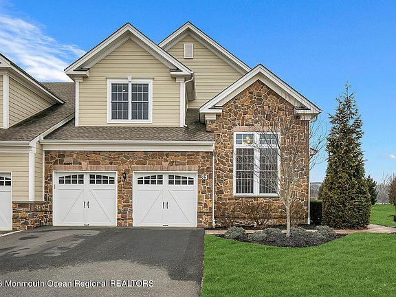 Come see this beautiful Ashton model at The Regency at Holmdel. This 3 Bedroom/3.5 Bath end unit boasts a premium lot with upgrades including Brazilian pecan wood flooring, ensuite baths for each BR, central vacuum, Century cabinets in the kitchen, and two-car garage with epoxy flooring including a plug for charging an electric vehicle. The unfinished basement is an additional 1,500 sq. feet with high ceilings and rough plumbing in place for a bathroom. The outdoor space features 500 sq. feet of deck and patio space with expanded and professionally designed landscape beds with stunning sunsets from the back deck. Easy proximity to all that Bell Works, PNC Bank Arts Center, and the area has to offer with a short distance to the GSP and transit to New York City make this home a true gem.