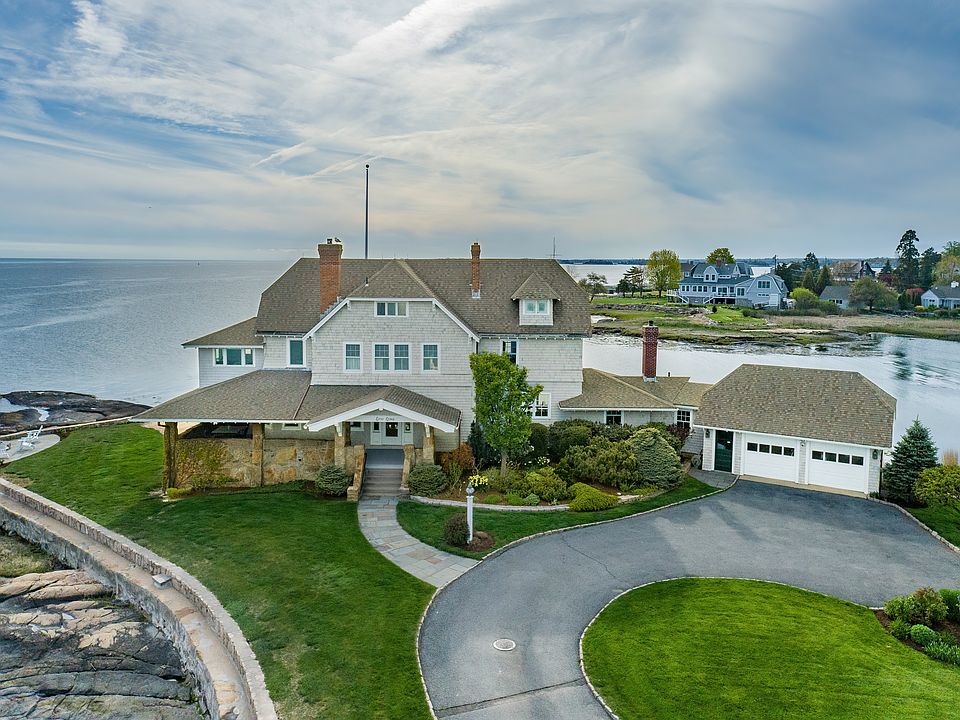A well-known photographer recently said, "I've been photographing properties on the waterfront for over twenty years and I have never seen a more beautifully sited house". Nestled in Sachem's Head, high on a private peninsula enjoying commanding views of Long Island Sound, the Thimble Islands and its own sandy swimming cove and dock, 31 Loyal Ledge stands tall. With 700+ feet of linear footage on the Sound & almost 360-degree water views, the 100+ year old house has been a cherished retreat to only four families. Each owner has enhanced the property with the latest upgrades completed this year focusing on updating the third floor to have an inviting living room, bedroom & new full bath.The first level offers an abundance of spaces and rooms to enjoy gracious living - a living room with a gas log fireplace and a wall of bookcases, a sunroom with five picture windows to the water, a formal dining room, and a large kitchen with both island and table seating and a cozy family room. There are also two covered, stone porches- one perfect for viewing the sun rising and the other its setting. The second floor has a large primary ensuite bedroom with a sitting area, an office and two nice sized bedrooms which share a bath. Outdoors, in addition to manicured grounds and the mesmerizing views of the islands, there are two areas perfect for entertaining - one features a fire pit, the other with a tall flagpole as its centerpiece.Watch the attached video.