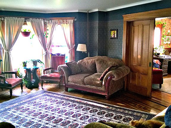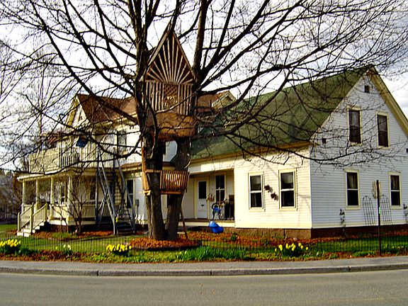 The Crowned Jewel of Hardwick, this elegant turn of the century 3800 square foot Victorian is beautifully maintained. Showcasing true 1800’s craftsmanship with its sculpted moldings, unique built-ins, and parquet floors it is situated just off Hardwick's lively downtown. With 13 rooms including a formal parlor, living room, dining room, large eat-in kitchen with Garland cook stove, an office with stately pocket doors and six bedrooms and three bathrooms, it offers a wealth of living and business possibilities. The charming Turret Sitting room overlooks the neighboring Townhouse which headlines numerous Vermont musical presentations throughout the summer months. A large dry basement offers a spacious work shop and laundry facilities. Property includes a two car attached garage, elegant wrap around perennial flower garden, an expansive, well-groomed back yard with established vegetable garden beds, children's playhouse, elaborate double deck tree house and hot tub. New oil boiler and high efficiency wood gasifier boiler keeps house warm without breaking the bank. Lot size is .6 acre. House has storm windows and spacious insulated attic. 2nd stairway offers multiple use possibilities. New roof on main house in 1999 and new cedar roof on turret in 2005. Beautiful woodwork in every room, intricate hardwood floors. 2 1/2 Baths, Vermont Castings woodstove. Apple trees, rhubarb, raspberries, blueberries and currents too.