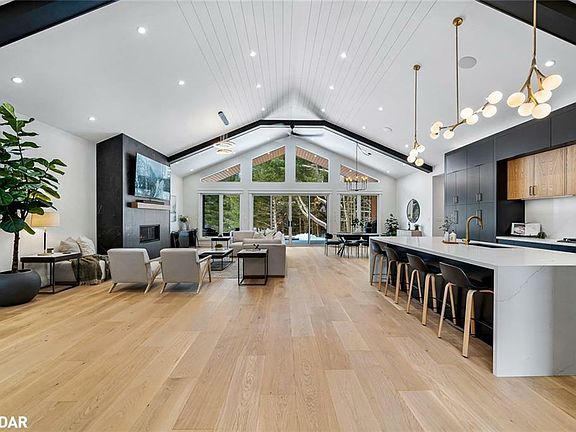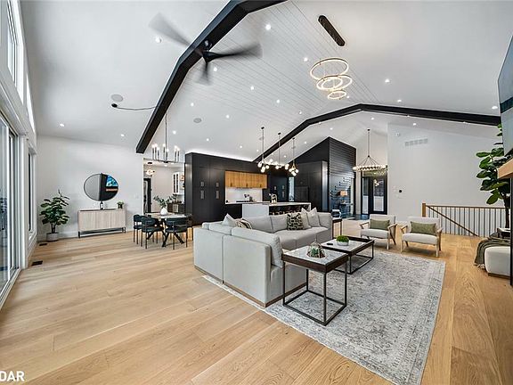 31 Marni Lane is a masterpiece of Scandinavian-inspired design, offering nearly 6,000 sq. ft. of thoughtfully curated living space. Every inch of this estate reflects a balance of elegance, innovation, and functionality. Vaulted ceilings, oversized windows, and radiant heated floors blend light, space, and warmth into a setting of understated luxury. The chefs kitchen is a vision of modern refinement, featuring sleek custom cabinetry, quartz countertops with a dramatic waterfall island, and Wi-Fi-enabled Samsung appliances. A butlers pantry with a prep sink adds both practicality and sophistication. Flowing seamlessly from the kitchen, the living areas feature a gas fireplace with custom tile accents, European white oak floors, and crown moulding, creating an ambiance of refined comfort. The primary suite is a sanctuary, with a cathedral ceiling, an expansive walk-in closet, and a spa-like ensuite boasting a freestanding tub, a barrier-free rain shower with quartz finishes, and LED-lit niches. Each bedroom offers thoughtful touches, from custom storage to serene design elements. The fully finished lower level elevates the home's appeal, featuring a soundproof home theatre wired for 5.1 surround sound, a recreation area with a built-in bar, and a gym equipped with a Sonos sound system that runs throughout the entire house. Two versatile rooms adapt effortlessly to your needs, whether for work or hobbies, while radiant heated floors ensure year-round comfort. The Scandinavian design extends outdoors, where low-maintenance Andex Steel cladding meets a stamped concrete front porch, landscaped pathways. Sustainable features include a pre-wired EV charging station, smart exterior lighting, and a gas hookup for outdoor cooking. A flower bed irrigation system and sprinklers maintain the pristine landscaping with ease. 31 Marni Lane is more than a homeits a lifestyle statement, perfectly harmonizing grandeur and tranquility.