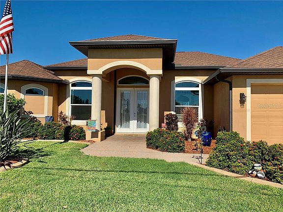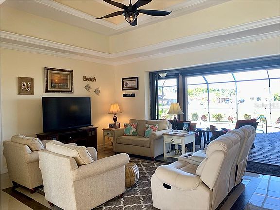 This meticulously maintained 3 bedroom 2 1/2 bath 2 car garage pool home with a den is a must see. This home offers a split open floor plan, tile flooring and lighted tray ceilings throughout. Step inside and you'll be impressed with volume accented by a double tray ceiling with soft lighting, 8' sliding glass doors to the lanai and a view overlooking the pool to the canal. The kitchen features 42" wood cabinetry with soft closing features, modern tile back splash, granite counter tops, stainless appliances and breakfast nook. From the living area is the dining room as well as the den/office with double doors. The large ensuite master has a lighted tray ceiling with crown molding, 2 walk-in closets, double vanities with stone tops, a beautifully tiled walk through shower and a jetted tub, access through sliding doors to the pool. 2 guest bedrooms on the other side of the home with a guest bath. Enjoy the large screened (re-screened 2019) lanai with pavers (sealed in 2019) and the heated (added in 2017) pool. All windows were replaced in 2019 with impact low E glass and the lanai area has hurricane shutters to secure the patio furniture when traveling. Just off the kitchen is a half bath and the large laundry room with a stacked washer/dryer, cabinets for storage and a work surface, the 2 car garage floor was professionally resurfaced in 2018, Xfinity security system, brick paver drive, fenced back/side yard and irrigation system using canal water. Call to schedule your showing today!