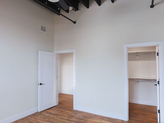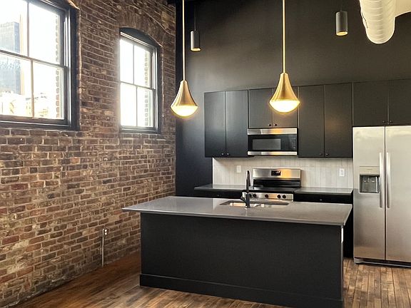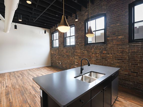 These 1-bedroom, 1-bath lofts in the restored 1896 Okun Produce Building feature hardwood floors, exposed brick, lofted ceilings, and designer kitchens with quartz countertops, soft-close cabinets, porcelain tile backsplash, brushed gold pendant lighting, garbage disposal, and water-and-ice refrigerators.