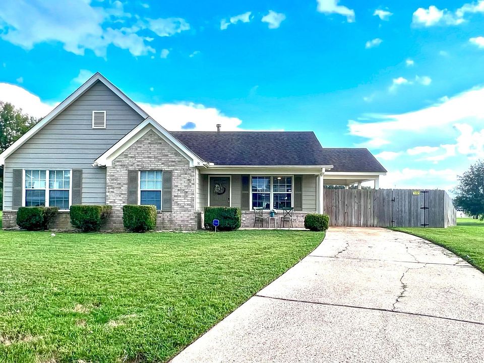 Lovely home situated on a quiet secluded cove. PRIME LOCATION! 3 bedrooms/2 full baths, located near the neighborhood park on an oversized lot. Totally surveyed lot features a fully fenced yard with a new storage shed and patio. Carport is attached and on the side, gas fireplace in the living room, recently renovated laundry closet that features nice shelves for a pantry. Appliances stay with frig and washer being new. Roof is about 5 yrs old. Also, Tipton Co. schools and close to Blue Oval!!