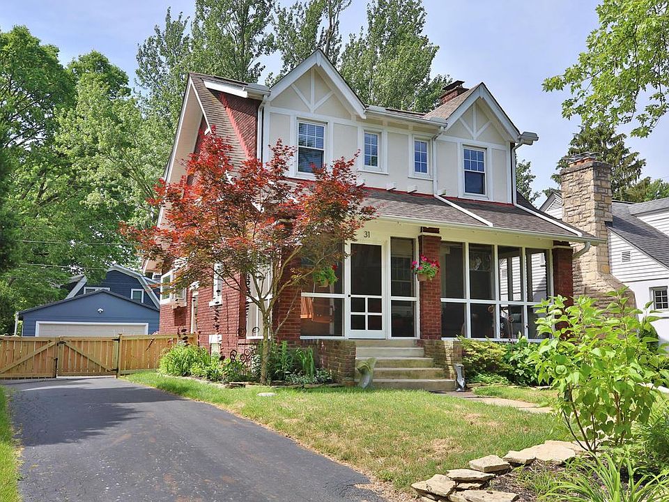 Distinctive European Tudor style home in Clintonville. Enjoy the neighborhood from the screened front porch, a relaxing outdoor rm. Interior features nuanced color palette, newly added gas frplc in vintage mantle. Circular flr plan, large DR connects to kit in 2 areas, rich oak flrg, Dining rm w/contemporary eclectic lighting, exposed brick wall. Indoor lighting updated throughout, new blinds downstairs. Updated kitchen - new SS appls, Bosch (17), GE refrigerator (17), new tile backsplash (17). 2 rm kitchen w/prep rm, generous counter space, storage. Lovely outdoor entertaining area, new wd fencing, patio! Basement: Large finished flexible space w/carpeted FR/guest suite w/private BA beautifully redone w/Carrara marble! Classic wine cellar! Enjoy life here