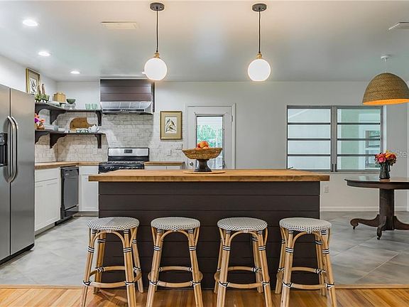 DOWNTOWN BROOKSVILLE! This recently remodeled home is perfectly located in quaint Brooksville's city limits. You will be in walking distance to public and private schools, restuarants, coffee shops and all of the Friday Night Live events. This 3/2.5 Southern Ranch has completely upgraded and rewired electric, a remodeld kitchen with a gas stove and enlarged en suite. The breakfast nook offers built-in storage and a view of the screened in back porch and oversized back yard. As you walk around the exterior, you will find mature landscaping that includes banana and citrus trees. The back room of the carport offers storage, electric washer and gas dryer and an outdoor bathroom including a sink. Built in 1963 and recieved a facelifted in 2019. What's not to love?