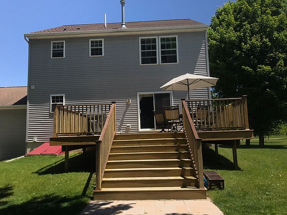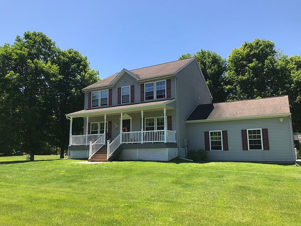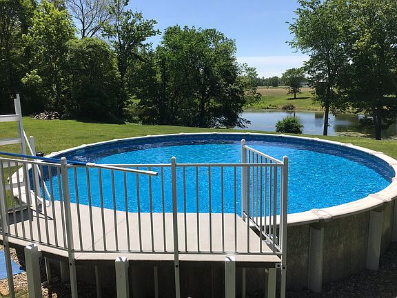 Like a vacation destination with water frontage on a gorgeous pond. Enjoy fishing, boating, winter sports, watching the beautiful wildlife & sunsets from your 16 x 20 deck on this 2.55 acre property. Exterior features oversized paved driveway, attached garage, carport with overhead door, new top of the line 28' Sharkline AG pool with alum deck, expansive tree lined front yard including 6 fruit trees (apple, pear & peach) full length covered front porch, new roof on west half of the home. Amenities include new central AC, hard wired gas generator, owner owned 500 gal sunken propane tank, new black stainless app. & a center island in kitchen, a new front entryway door with storm door, finished office & rec room in basement. Spacious Master Suite, 2nd Flr Laundry, Open Flr Plan & Much More.