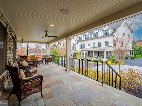 A lovely Town Home with a private elevator, located in the heart of Narberth built by Vincent P. Sposato and completed in 2019. A low maintenance lifestyle within walking distance to Narberth restaurants, train station, stores and two public parks. The attention to detail is evident throughout this beautiful home. The exterior has a stately stone first level boasting a gorgeous flagstone wrap around porch with cool black rails. A great place for entertaining, ceiling fans provide a nice breeze and enjoy music from the custom built-in speaker system. The exterior also boasts a rear entry two car garage, James Hardie Plank siding and oversize, black trim Pella double hung wood windows. A metal standing seam roof over the covered porch completes the very handsome exterior. Enter into the main level from the front porch and you are greeted by an open living plan. Many custom built-ins and mill work, including window bench seating on each side of the gas fireplace as well as bookshelves, crown molding and gorgeous new hardwood floors that flow throughout this stylish home make the space feel warm and inviting. The fabulous gourmet kitchen is the hub of the home. 42” white custom wood cabinets and darker toned island cabinetry are very smart looking and offer abundant storage. Any person who likes to cook will love and appreciate the high end appliances, including Wolf Double ovens (one with a pizza stone) a five burner Thermador professional cook-top and Thermador exhaust fan, Bosh dishwasher, double bowl sink in the island and a drawer microwave. An abundance of Quartz counter space from the Peninsula and the Island offers great preparation and serving space. The spacious dining room is next to the kitchen island and it has a beverage refrigerator, cabinet storage and floating shelves that match the kitchen. The living area is spacious and unique. Located on the other side of the Peninsula it has Built in cabinetry, window seats, book shelves and crown molding. Many large windows flood this room with natural light. There are built in speakers, an oversize walk -in closet and a powder room. The elevator entrance is just to the side of the wide wood stairway that leads to the upper levels or down to the finished lower level and garage. The Primary Bedroom is located on the top level of this lovely home. It is Accessible via the elevator or the spacious wood stairway. Being an end unit gives this top floor very nice tree top views of many Narberth streets and homes. This bedroom is flooded with natural light from the 4 oversize windows. The hardwood floors extend throughout the bedroom and the custom fitted walk in closets. A sumptuous bath is attached to the bedroom With heated tile flooring, A Kohler soaking tub, double sink vanity and over size ceramic tile walk in shower with partial glass doors, this is a great area to relax and unwind. The second floor offers two very nice size bedrooms each with a walk in closet and full bathroom. They are sunny and bright and have warm hardwood floors. The full laundry room with built in cabinetry is on this floor also.The lower level is very spacious and has a vinyl tile floor, a sink/cabinet with a garbage disposal and storage space. There is a convenient half bathroom, closet storage and access to the two car garage. Best of all is the full size walk out door with a full view storm door that leads you to the landscaped side open area. The two car garage has an Electric car charger, hose bib, and extra storage closet. Some of the many upgrades of this lovely home are: Upgraded countertops, high hats, hardwood flooring throughout most of the home, custom lighting, additional drawers in vanities, security system, and a Kinetico water purifying system with reverse osmosis system at kitchen sink and in refrigerator. This is a small townhome community with 9 unique homes. Quaint and tucked away but, so convenient to Narberth, Wynnewood and Ardmore shops and restaurants.