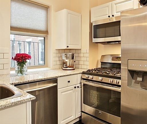over with new and vibrant residential development, restoration of green park space, and steps from bustling restaurants such as Sweet Cheeks and The Citizen Publick House, this is a jewel that most certainly stands out and shines! A spacious vestibule greets you upon entrance, and then leads you to an elegant and bright living room. High ceilings, large windows and lush mahogany stained hardwood floors make this a gracious space for entertaining. A pass through with marble breakfast bar looks into the sleek and sophisticated kitchen that boasts a white speckled granite counter, stainless steel appliances and white cabinets. A white subway tile backsplash adds character, and the black marble floor tiles are a good foil. The bedroom is generous in size. Heat and hot water are included in the rent. Common laundry.