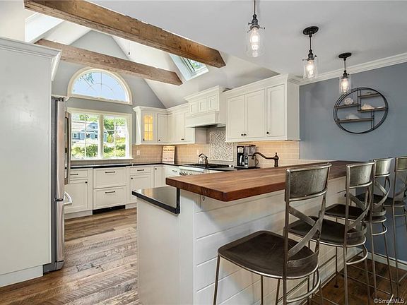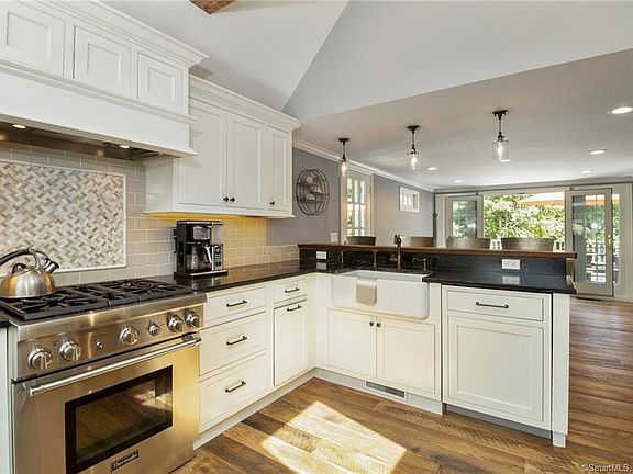 Discover this one of a kind home, located a kid friendly cul-de-sac that is in the middle of Westport. Walk to Terrain for coffee, or bike to the beach from this private enclave. You will immediately feel the happy vibe that invites family and friends to gather here. The flexible, open flow inside and out is the hallmark of this vintage home and the secret to its appeal. Custom crafted renovations seamlessly incorporate a modern vibe into this vintage home. The gut renovated kitchen features reclaimed wide board wood flooring that was carefully selected from The Hudson Company, and handcrafted beams supporting the vaulted ceiling where natural light abounds. Acres of beautifully honed soapstone counters, a useful pantry, and breakfast counter brings timeless functionality. Dining area has French doors that open to a large deck overlooking the large back lawn outlined with a pretty stone wall topped with a picket fence and a site for a pool. A generous family room with fireplace & lots of windows also opens to the large deck and backyard. A private 1st floor master suite has a full bath, 3 closets, including a large walk-in, plus an office/workspace. Upstairs is accessed from a front and back staircases where you will find open space with built-ins. 4 bedrooms and 2 baths complete the upper level. Prepare to fall in love with this unique home, centrally located in-town on a peaceful cul-de-sac that is minutes to the beach, train, shopping and great schools.