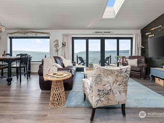 Unbelievable no bank beachfront cottage on Hat Island a short 20-minute ferry ride from Everett! This outstanding home was completely updated & enjoys amazing views & Southern exposure. New Andersen windows & doors, LVP flooring, Kohler fixtures, shiplap throughout, ductless AC & spa-style bathroom w/heated floors. Entertainment-sized deck features an outdoor shower, fire pit & new hot tub. Relax & watch the sunset over the Olympics or the crossing of the Mukilteo ferry. Clamming, crabbing & beachcombing are steps away. Watch harbor seals, eagles & herons from the comfort of your living room. Tidelands & deepwater mooring buoy. Island features a beautiful marina, private ferry, golf course, pickle ball/tennis court. Comes mostly furnished.
