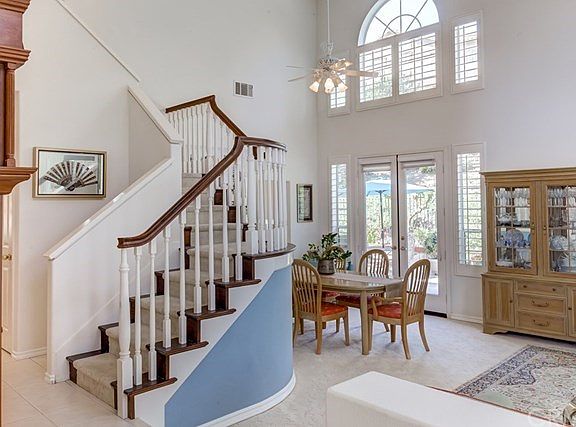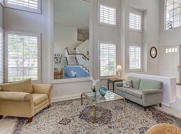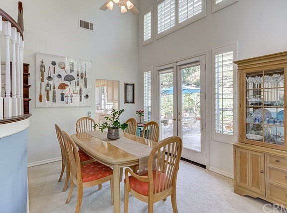 Welcome home to this end of culdesac home in Foothill Ranch. Double Door Entry opens to 20+ foot vaulted ceilings with custom framed mirror, 3 sets of french doors, gas fireplace, plantation shutters throughout, and hardwood flooring upstairs. The light and bright kitchen has white cabinets, garden window and french doors to the side patio. Downstairs powder bath and laundry with INCLUDED washer and dryer. Upstairs the 4th bedroom is built out as an office with custom built-in double desk with soft close drawers, custom built-in bookcases and double french doors leading to a front balcony. The Master Suite has hardwood floors, vaulted ceilings with ceiling fan, bathroom with marble floors, double sinks, deep soaking tub and separate shower, his and hers closets, and plantation shutters. Two secondary bedrooms with closet organizers, ceiling fans and secondary full bath off the hall. New Trane A/C Unit and new Water Heater installed. 3 CAR GARAGE complete with custom wood garage door, 18 foot workbench with Craftsman drawer and tool storage, and wall of storage cabinets. Adjacent Community Park with play structure, large grassy lawn and half court basketball court feels like an extension of the yard. Park-like grounds include paver lined patio, wrap around yard with trellis and secret garden, tranquil two tier fountain, mature roses and bouganvilla and your own community "Little Library". Enjoy proximity to Whiting Ranch Wilderness for hiking and biking and As