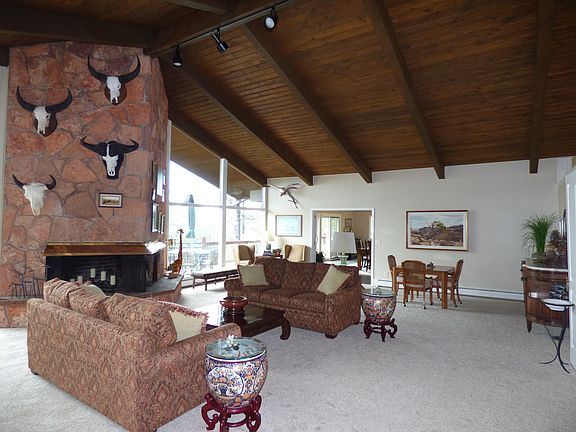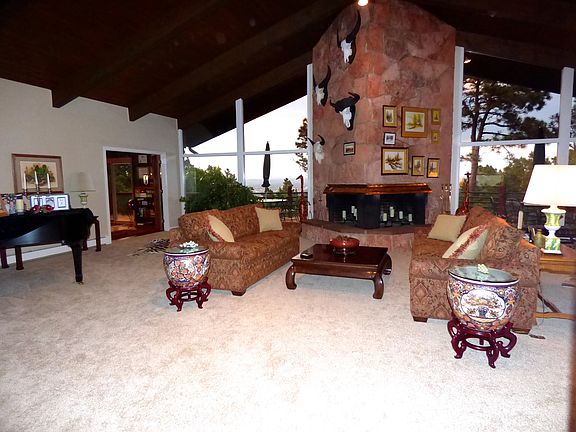 This home is a hidden gem tucked into the side of the mountain with loads of sun filled living areas !! Must see this incredible home featuring spacious open rooms, wood beamed ceilings, red rock sandstone fireplaces, sauna, wine cellar, theater, beautiful wood and concrete decks and walkout lower level to huge side yard & an 18' X 40' swimming pool. Nestled on serene .65 acre treed lot overlooking the city. Iron gates open to private front courtyard with gardens, mountain and city views and floor to ceiling windows. WOW ! Main level great room's wonderful fireplace is flanked by massive walls of glass with city views. Formal dining w/slate floors opens to wrap-around deck that is 90' in length! Kitchen offers a casual dining area, tiled floors, quartz & butcher block counters, 2 islands and Kitchenaid stainless appliances and gas cook top w/ lots of cabinets. Main level master w/fireplace, sitting area, walk-in closet & beautiful 5-piece bath. Master bath has dual vanities w/ cherry cabinetry, jetted Whirlpool tub, glass block shower & slab granite counter tops. Impressive main level office w/ wood floors, wood ceiling, built-ins & walk out to the wrap around deck. The incredible walkout lower level features a huge family room w/natural slate stone floors, red sandstone fireplace, entertainment center & a glass block counter bar and adjacent wet bar w/ slab granite counters, granite sink and dishwasher. The lower level family room accesses a huge patio next to the heated pool with loads of room to play and entertain. Around the corner a hallway leads to a half bath w/sauna, a wine cellar w/ tiled floor and a theater room which could be easily turned into a 5th bedroom w/private 3/4 bath. Lower level has 3 guest bedrooms with lots of storage and three updated bath rooms.