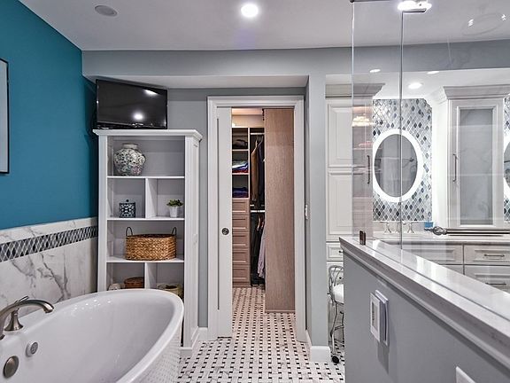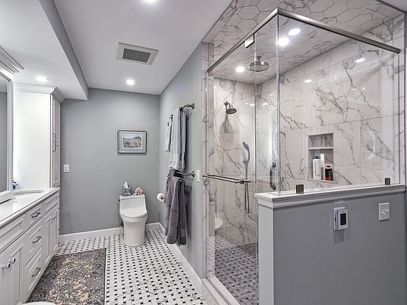 As you step into this completely remodeled garden condo you will be greeted by the beautiful spacious foyer, from there you will find a guest bedroom with access to a full bathroom. The dining room is to the left with chair rail, a bow window that lets in the natural light and opens up to the updated kitchen with quartz counters, stainless steel appliances and a breakfast nook booth with seating and storage. The living room has sliders to the composite deck, built in book shelves, gas fireplace and cathedral ceilings. From the living room you can enter the enclosed heated porch with plenty of windows and sliders to the paver patio. The main bedroom has an ensuite that has been beautifully remodeled, with heated floors, walk-in closet, soaker tub and an oversized tiled shower. On the second level you will find the loft area that can be an office, a 3rd bedroom or another tv room. The finished lower level has a bar, 1/2 bath, pool table, family room, exercise room, work room and laundry.
