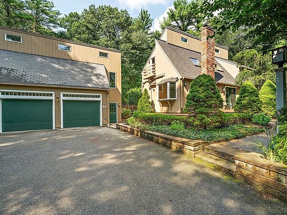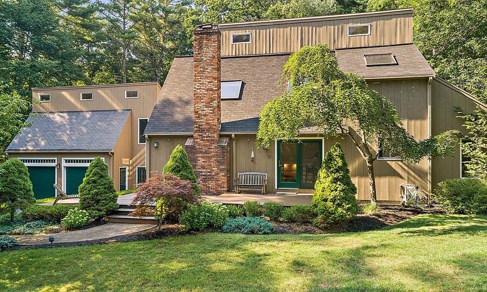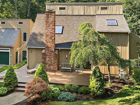 Welcome to your full-time retreat. A well-maintained, unique contemporary home on a cul-de-sac with nearly 2 private acres of beautiful, mature landscaping and plenty of outdoor entertaining space. Wide pine floors cover 3 levels of light, airy living space with cathedral ceilings and skylights. Entertaining is easy with the bright, open-concept kitchen, dining, and living areas. The home's 2nd level has two generous bedrooms, full bath, and loft. The private, 3rd-level owner's suite includes a Juliette balcony, en suite full bath, and walk-in closet. A detached 2-bay, heated garage houses a quiet, 400+ sq ft office (or playroom) above. Recent upgrades include 5 Mitsubishi heat pump/AC units, gas range and fireplace insert, generator hookup, 2 patios, decks, siding, exterior paint, expanded irrigation system, and landscaping. Explore the patios, decks, walking trails to Hamstead, and privacy in the fully-fenced backyard as you (and your guests) grill and relax by the fire pit.