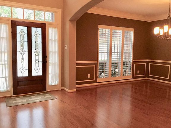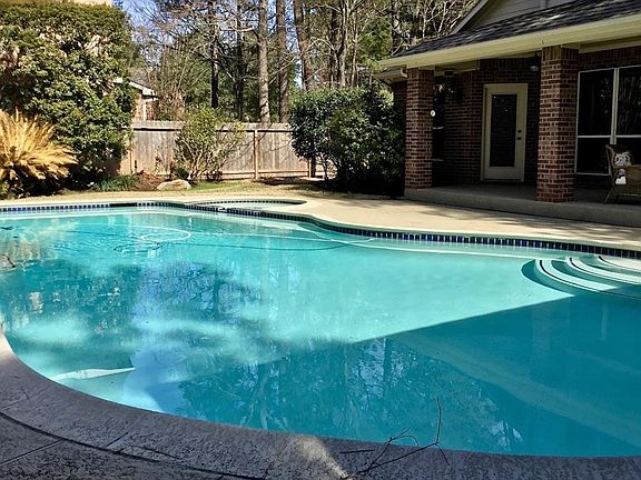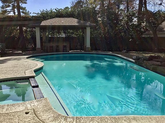 Sensational Emerald 2 story home on an oversized, wooded lot in Alden Bridge! This Energy Star Home features soaring ceilings, stunning hardwood flrs, built-ins & curved archways. Island kitchen w/granite counters, brkfast bar, stained cabinets & dbl ovens opens to breakfast room & den w/stone FP; both formals; study w/French doors; master suite down; gameroom up; resort style yard has covered patio w/seating overlooking huge pool, spa, summer kitchen, lush landscaping & mosquito misting system.