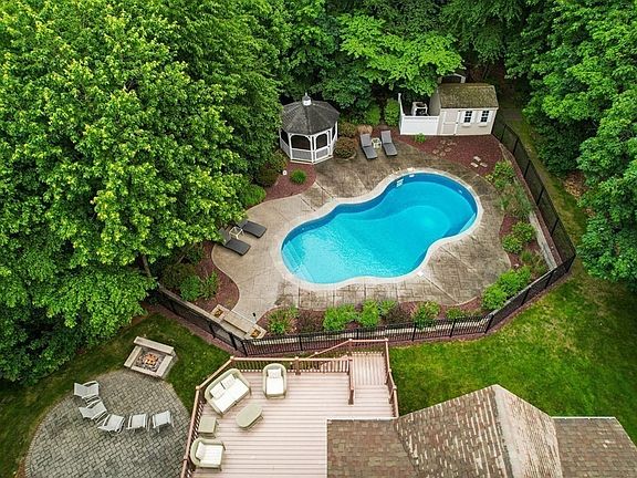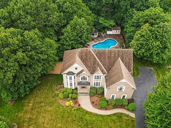 Springwood Estates! Spectacular brick-faced Colonial & 3 Car Garage offers pretty curb appeal, impeccable, well-landscaped grounds complete w/ saltwater heated pool w/ gazebo & shed all fenced separately from play yard & firepit! Open Floor plan offers spacious white Kitchen w/ granite, center island, ss appliances & slider leading to deck! Curved archway leads to fireplaced Family Room w/ oversized window, lighted built-ins & back stair. 2 Story foyer; 1st floor Office w/ built-ins. Front-to-back Living/Dining Room walkout bays. Moldings galore. Main Bedroom w/ cathedral lighted ceiling, gas fireplace, & his & her organized closets. Main Bath w/cathedral cove lighting, double vanities, jacuzzi & travertine shower. 2nd Floor office w/ built-ins. 3 good size secondary Bedrooms. Hall Bath w/ double sink vanity, granite, tub/shower & tile floor. Finished walkout basement Game Room w/ seated bar, granite top, fridge, gas fireplace, slider/windows; Exercise Room w/ rubber floor & Bathroom!