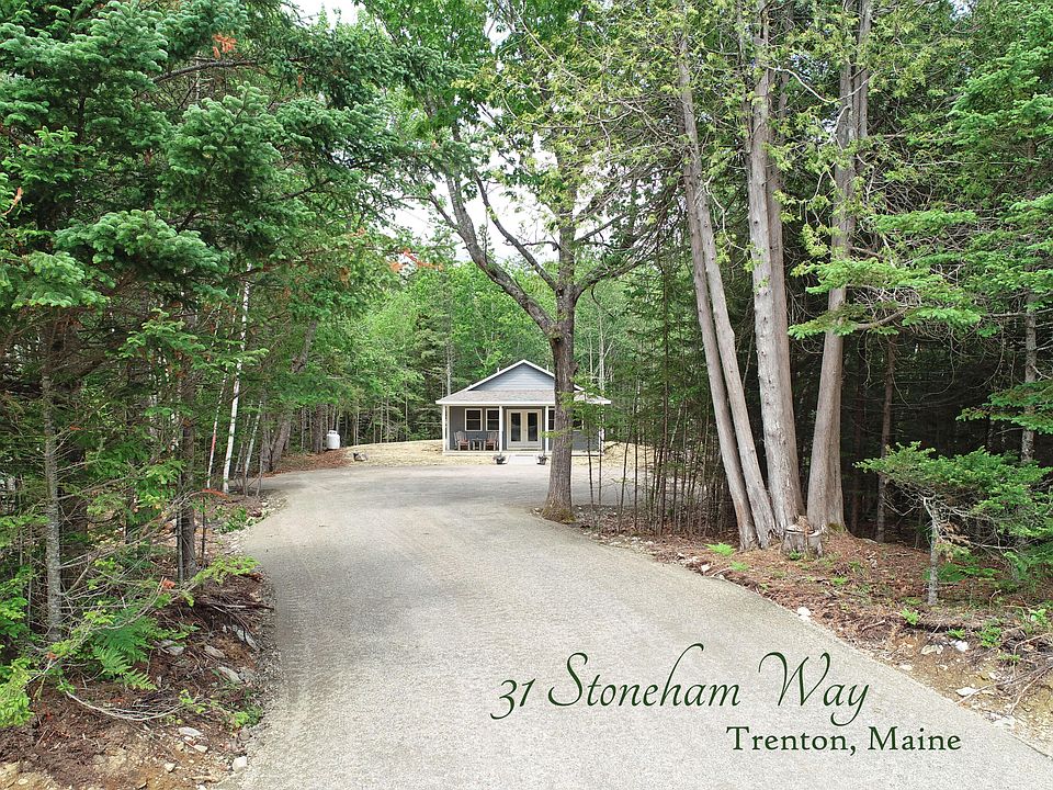 Thoughtful stick-built construction, low maintenance ownership & the delight of living in one of Trenton's best neighborhoods all come together in this 2023 home build. The single level floor plan includes primary bedroom with en suite bathroom, equal sized guest bedroom with en suite bathroom, office (or 3rd bedroom), open concept kitchen-dining-living room with coat closet/pantry and a laundry/mudroom with utility closet. The main living area's ceiling is white washed V-match pine, while the entire home's flooring shines with hardwood birch, lending a wonderful touch of contrast & character. The open concept great room allows for a number of furnishing arrangements and stares to a South facing wall of glass providing abundant natural lighting. A double glass door front entry opens to a classic full width, 8' covered porch and will be a favorite spot for many. You'll find a complete suite of stainless steel kitchen appliances in the kitchen, along with granite topped counters & island and custom, soft-close maple cabinetry. The laundry/mudroom is accessed from the hall or side exterior door and is home to a laundry area and utility closet that neatly encloses the home's propane heat system. You'll keep warm quite efficiently with in-floor radiant heat, sure to be a hit with your pet. Interior details include solid pine doors, custom door & window trim and many built-in closet storage areas. Mature forest surrounds the home, including several giant hardwoods that create a spectacular Autumn display each year. The 1.07 acre lot's feel is secluded and close to nature. Just East of the parking area is the perfect location for a garage to be built. Stoneham Way is a private, dead-end road with Spectrum service. Perfectly situated between Mount Desert Island & downtown Ellsworth, both locations are quickly accessed via lightly traveled back roads. Lovers of Acadia will find daily hikes & bikes only a short drive away, making this new home all the more lovable.