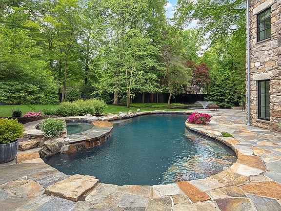 Celebrated interior designer Yvonne Ferris reimagined this classic fieldstone home in the heart of Old Hill as a modern paradise. Striking, open living spaces embrace brilliant natural light and refreshing minimalism throughout. Floor to ceiling windows reveal ever-changing vistas, creating a tranquil backdrop for a happy home. Guests will love to gather in the bold eat-in kitchen and a sun-drenched home office forms an inspiring work-from-home space. Open the French doors in the family room and step out into the sunshine on the stone terraces surrounding the pool/spa, a private oasis made for summertime entertaining and lingering by the water's edge. An impeccably-landscaped park-like acre is embraced by mature trees and home to a gentle brook and pond. Retreat to the master suite at the end of the day and enjoy relaxing under the stars on terraces overlooking the pond and brook. Simply serene.
