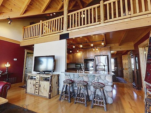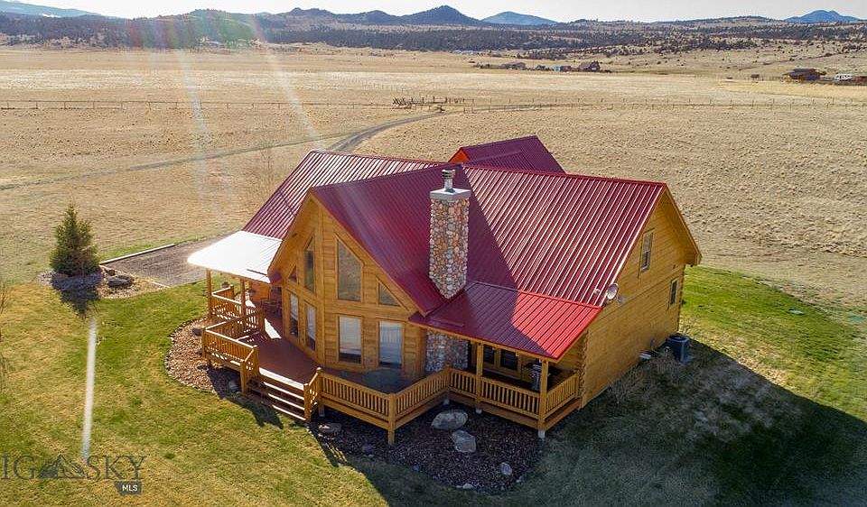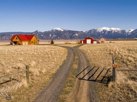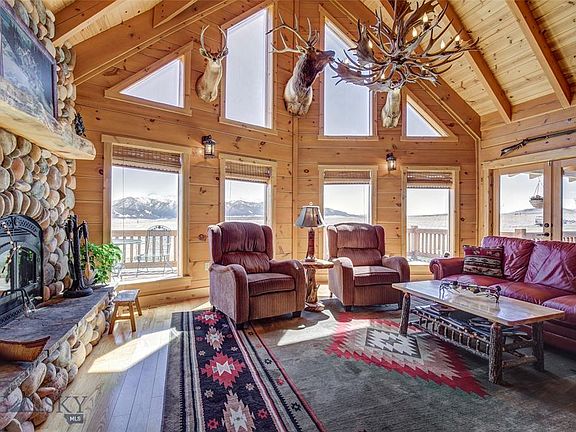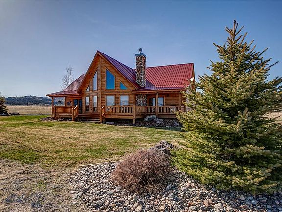 Privacy is finally yours! An hour to Bozeman and half hour to Butte, this 3,566 sq. ft. log home is in a minor sub with 25+ acres. Add the guest house's 575 sq. ft. for a total of 4,141 living area. The great room boasts a gorgeous antler chandelier, handsome river rock fireplace overhung with a live-edge mantle and an east facing wall of cascading windows with mountain views all around. The spacious master bedroom features a covered deck with mountain views, walk-in closet, and en-suite with dual sinks and large tiled shower and jetted tub. Remaining is the custom kitchen, dining room, three more bedrooms, and 1.5 more bathrooms. Big toys are outside in the huge metal barn with heated/insulated shop. Landscaping and gardens are easily maintained with underground sprinklers and drip irrigation while the 2-car garage shares a wall with the RV area that includes a 30-amp receptacle and an emptying station.