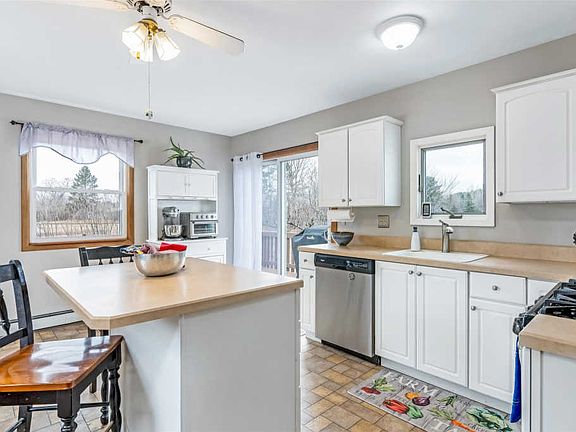 Cape-style home located in an ideal Jericho neighborhood with Mt. Mansfield views! The open floor plan in this 4-bed, 1.5-bath house creates a spacious environment throughout the first level. Adorable front porch and white picket fence lead you into the home. Upon entering, youâll be greeted by the bright and open living room, featuring three windows filling the space with natural light. The sunny eat-in kitchen includes attractive white cabinets, an island, and a pellet stove to help keep you warm on winter evenings. The kitchen has a sliding glass door leading out to the back deck and fully fenced-in backyard. The large backyard offers endless potential for gardening and other recreational activities. There are currently 4 well-kept macintosh trees, as well as a 21-row garden bed. The first floor has three bedrooms, a full bath with a whirlpool tub, and a half bath. The second level includes a large bedroom, currently being used as a den and office, and a bonus storage area. Full partially finished basement, and oversized 1-car garage. This home is located on a quiet cul de sac within close proximity to schools, playgrounds, and tennis courts. Nearby local attractions include Palmer Lane Maple, The Jericho Café & Tavern, Old Red Mill Park, and Jericho General Store. The property is a mere 25 minutes to Burlington, and even closer to Essex, as well as a short drive to Mt. Mansfield and neighboring ski areas. Donât miss out on this amazing property in the heart of Jericho!