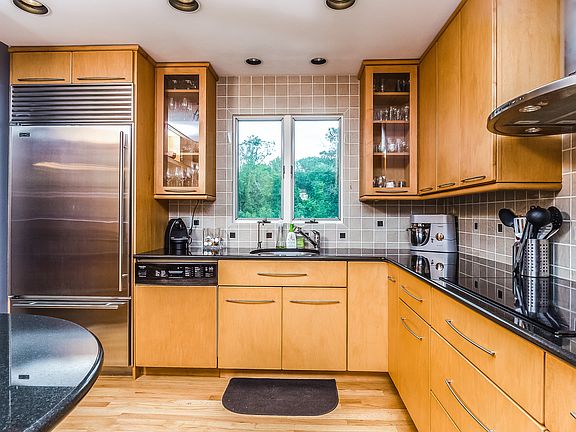 Move Right in to this completely updated and upgraded 5-bedroom home. Set near apple orchards with a luxurious, private backyard, this contemporary home features top of the line kitchen appliances: subzero refrigerator, Miele Hood fan and and dishwasher, Dacor Cooktop and Double-Ovens, with black granite and birch cabinets. Deck just off the dining room for entertaining, BBQing, or gazing to the backyard. There are three bedrooms on the upper level and two bedrooms on the lower level. Lovely hardwood floors upstairs and newer windows. Fireplaces in the light-filled living room and in the den downstairs. Heated floors on the lower level. Two-car attached garage. Expansive driveway with room for guests to park. A well-appointed finished contemporary home with all the details finessed.