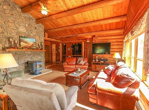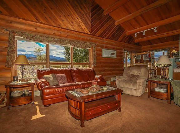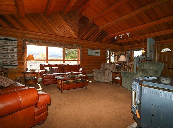 Enjoy the panorama mountain views and river frontage from this western design log home. Includes open floorplan, step down living room with large moss rock hearth and pellet stove, sitting and dining areas. Large shop and R/V storage building (14' sidewalls) includes 13' and 10' overhead doors along with a bath/storage/shop and finished loft area. Three-sided pole outbuilding and greenhouse.